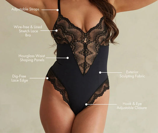 We have combined our patent-pending sculpting lining with compressive fabric and exquisite stretch lace detailing to create a shaping garment that is both visually appealing and practical